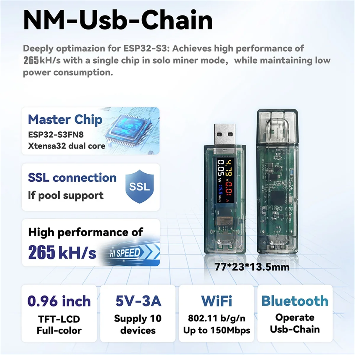The NM-usb-chain is a NMMiner development board. At first glance, you may think it's just an ordinary ammeter or USB Tester, but in fact it's also a BTC lottery ticket. It can not only provide the precise current measurement, but also achieve the 300% high Hashrate 265KH/s over other ESP32-S3 lottery. Most importantly, the nm-usb-chain includes a male USB-A port and a female USB-A port. Multiple usb-chains can be connected in series to form a lottery chain, which is really interesting. Of course, this is not all of the nm-usb-chain functions. With the usb-chain device, you can do that: Daily work and life current monitoring. Lottery when charging your phone. Double your lottery device hashrate without any power supply device added. Such as usb-chain + T190, usb-chain + for T Dongle S3, etc. Due to different batches, there may be differences in product appearance and printed text, which not affect use. Colour:As Shown Material:Plastic Package Contents: 1 * NMMiner Only the above package content, other products are not included. Note: Light reflection and different displays may cause the color of the item in the picture a little different from the real thing. The measurement allowed error is +/- 1-3cm.